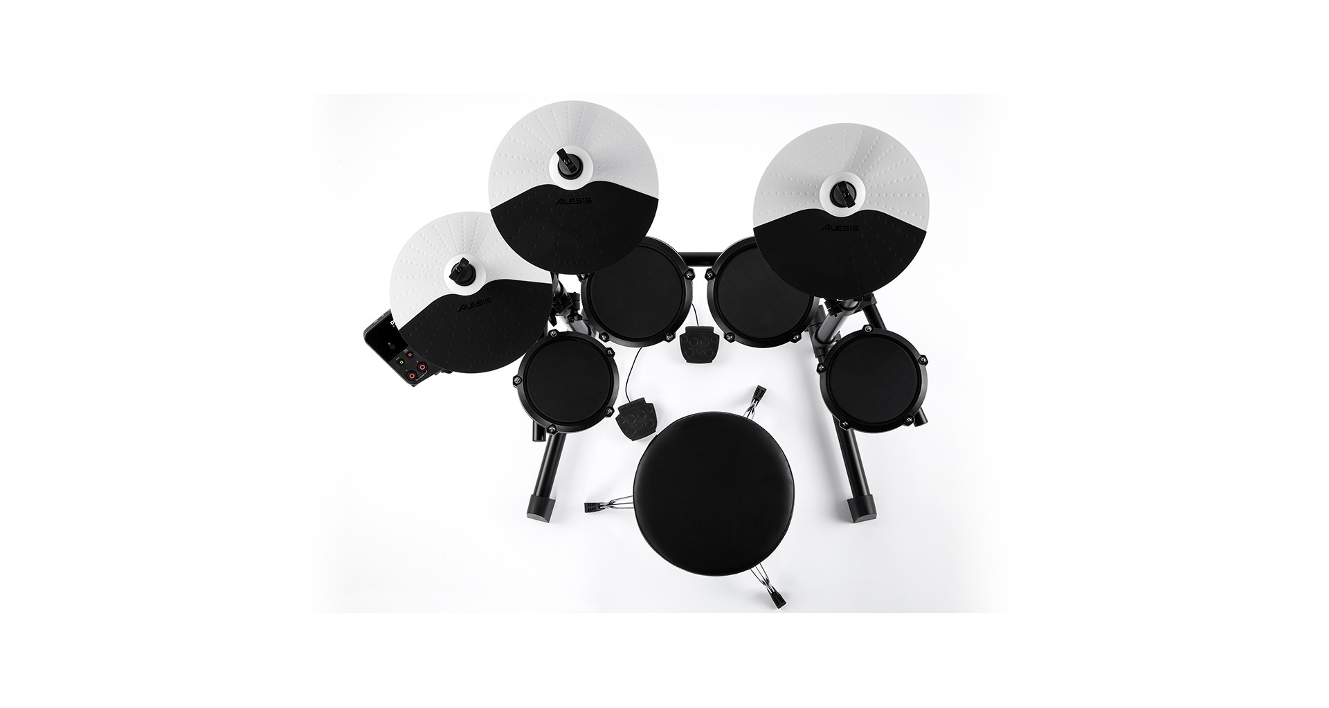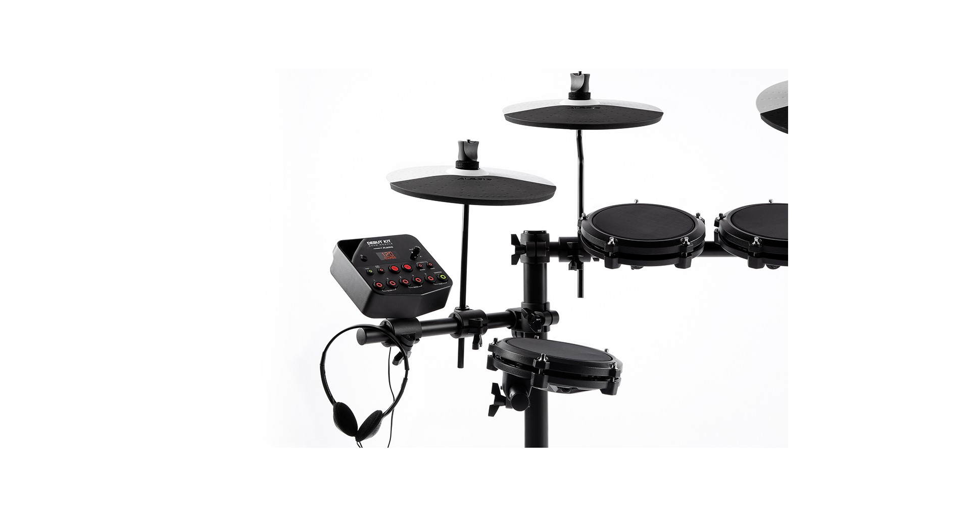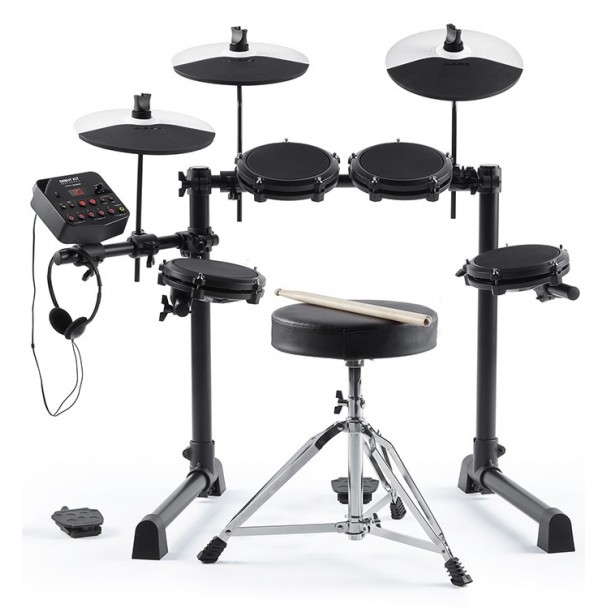 Tobe Electronice Alesis Debut Kit - tobe electronice ideale pentru incepatori. Ofera 10 kit-uri de tobe, 120 sunete, pad-uri tip mesh silentioase, control toba mare si fus prin pedale speciale, dimensiuni compacte, economice ideale pentru apartament sau spatii inguste.