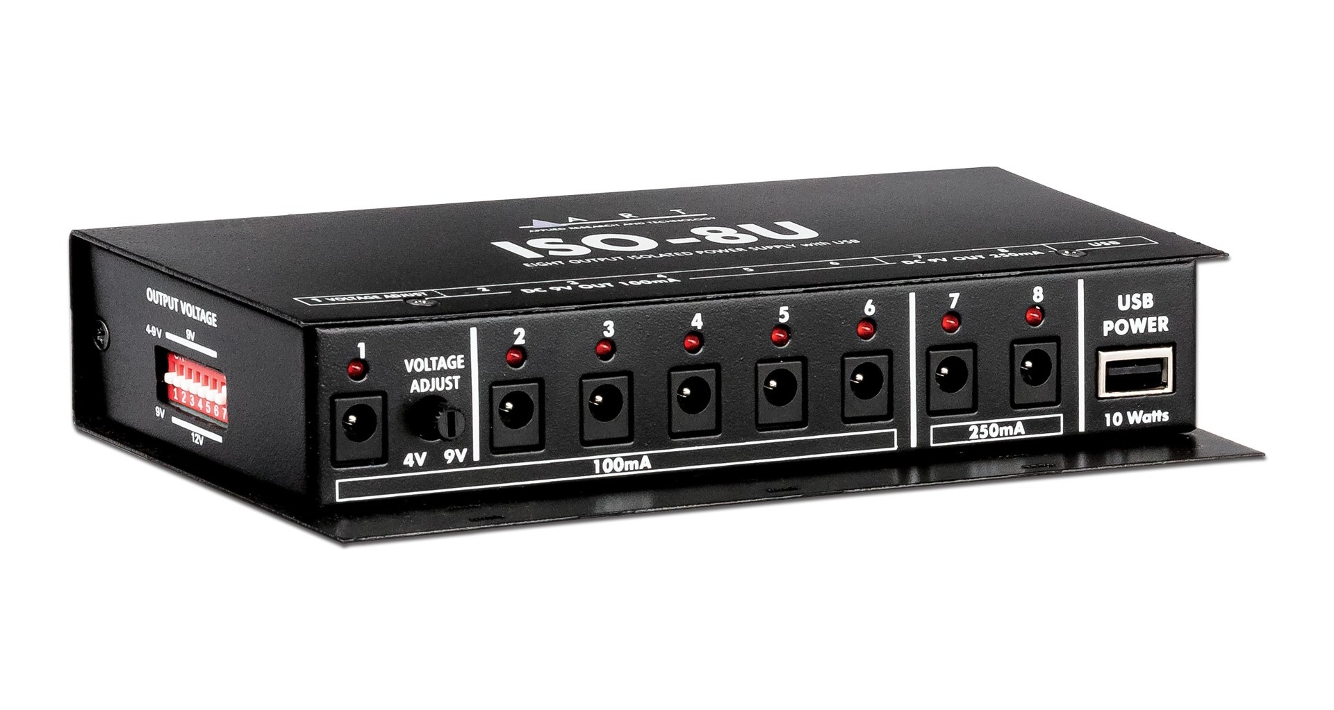 Alimentator pentru 8 pedale de instrumente. Acesta ofera doua iesiri cu 250mA si o iesire de 4-9V care simuleaza o baterie consumata. De asemenea, 7 dintre iesiri au putere ajustabila (9V sau 12V). Este ideal pentru pedalboard-uri cu multe unitati si are o constructie foarte rigida.
