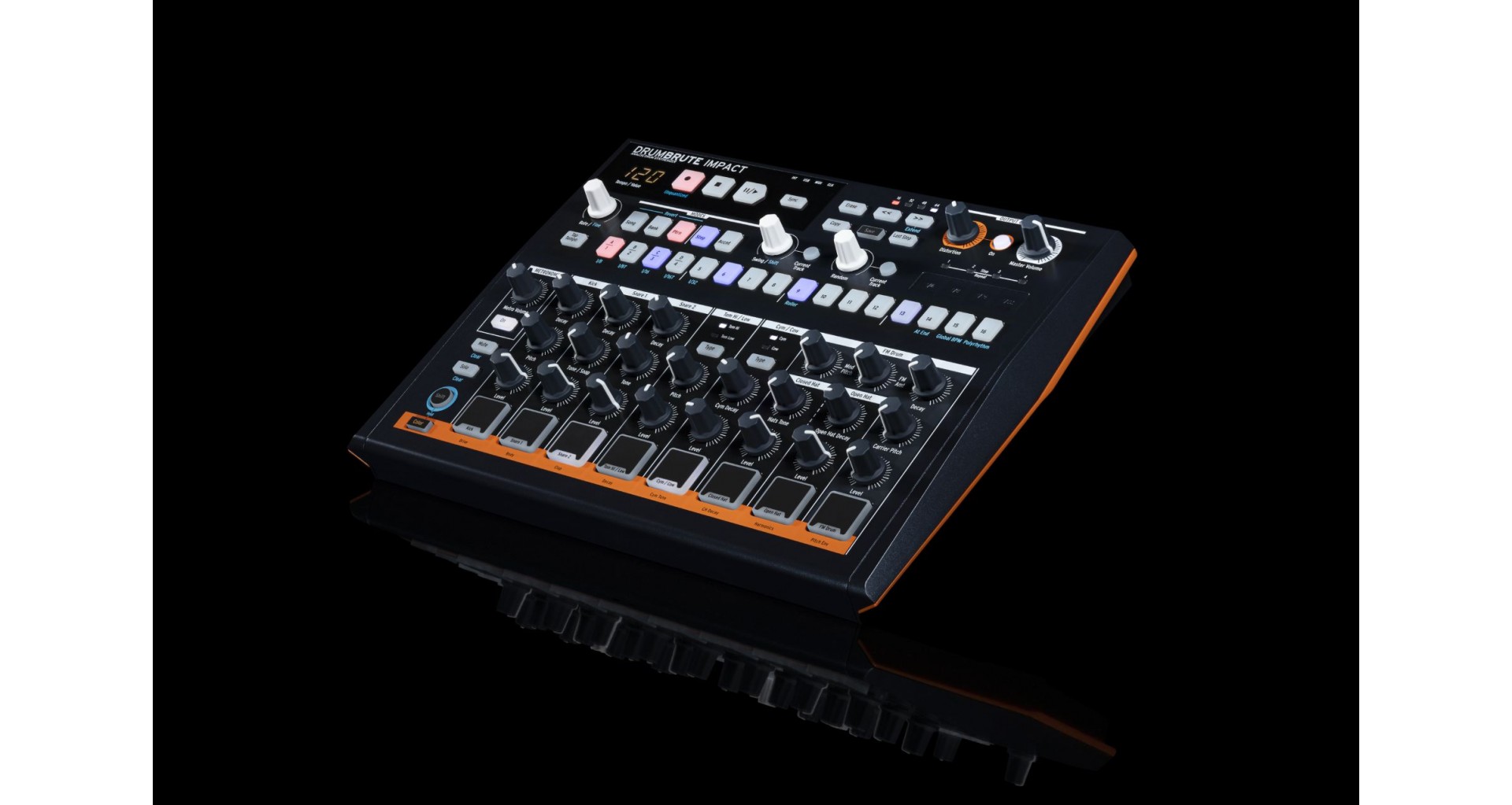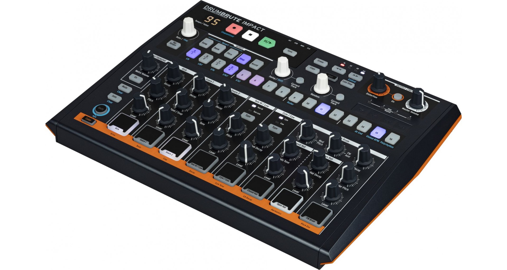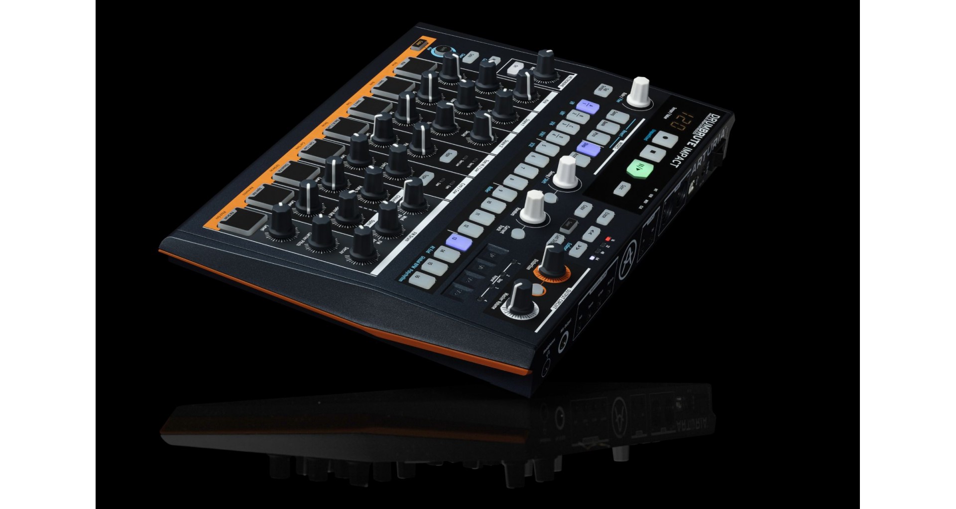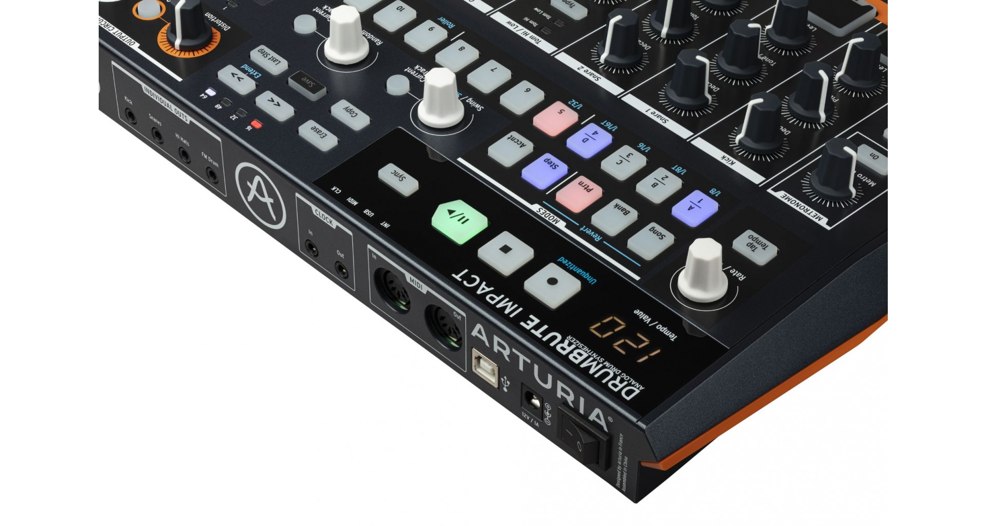 Arturia DrumBrute Impact este o masina de ritm analog cu 10 sunete distincte: Kick, doua Snare-uri, Tom-uri Hi/Low, Cowbell, Cymbal, Closed/Open Hat si FM. Poate fi controlata direct prin knob-urile dedicate pentru pitch, decay, tone, accent, functie Color si distorsiune pe master. Secventierea include 64 de pattern-uri de pana la 64 de pasi, poliritmii, swing global sau pe instrument, pattern looper, randomness si song mode. Dispune de iesiri individuale, MIDI/Clock/USB sync si metronom inteligent.