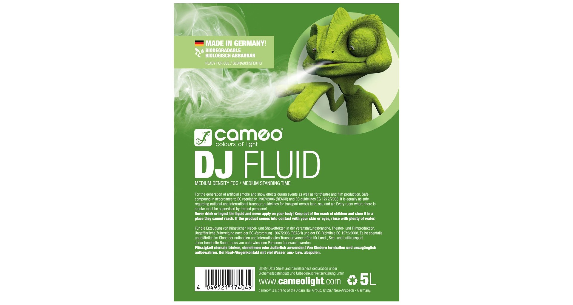 Cameo DJ Fluid fabricat in Germania este inodor, netoxic si biodegradabil. fisa cu date de securitate DIN si un certificat de conformitate sunt disponibile pentru descarcare. Calitatea sa este monitorizata continuu. recipientul este reutilizabil.