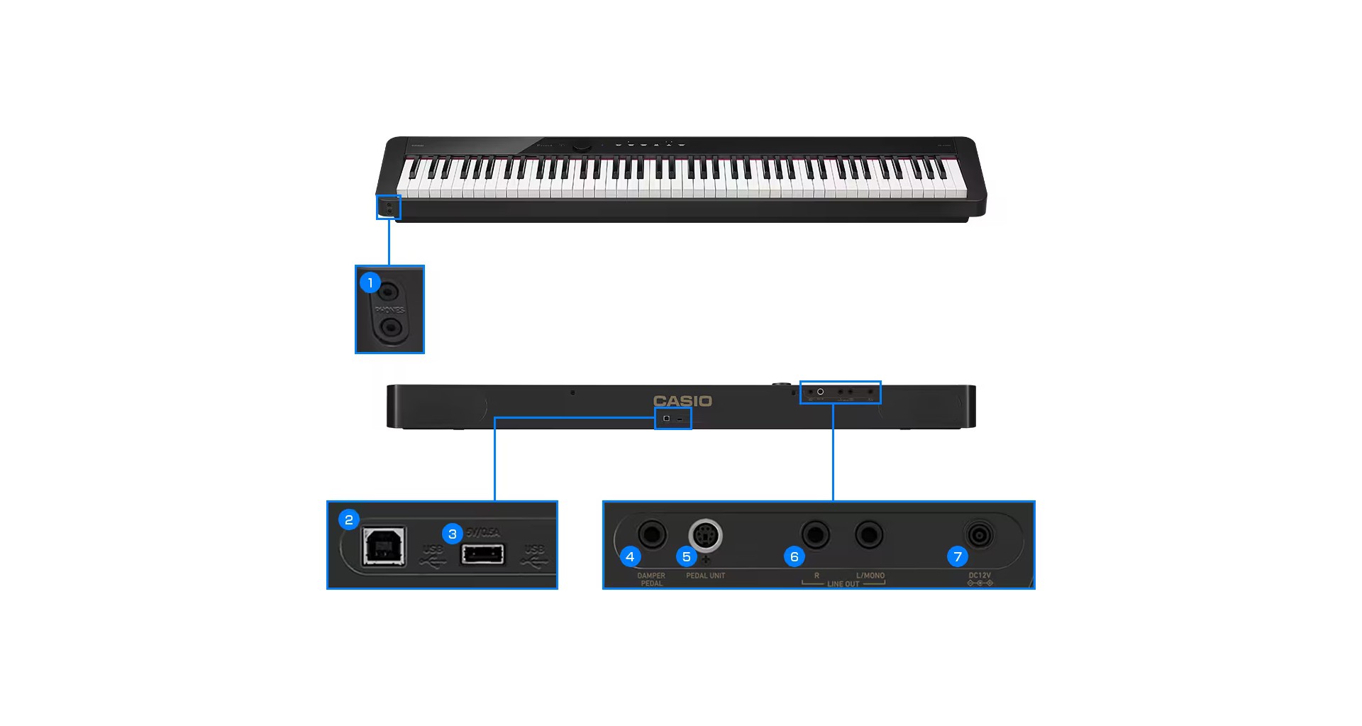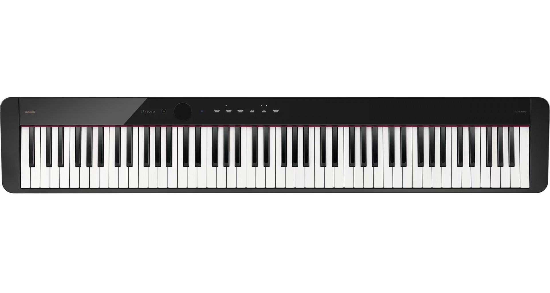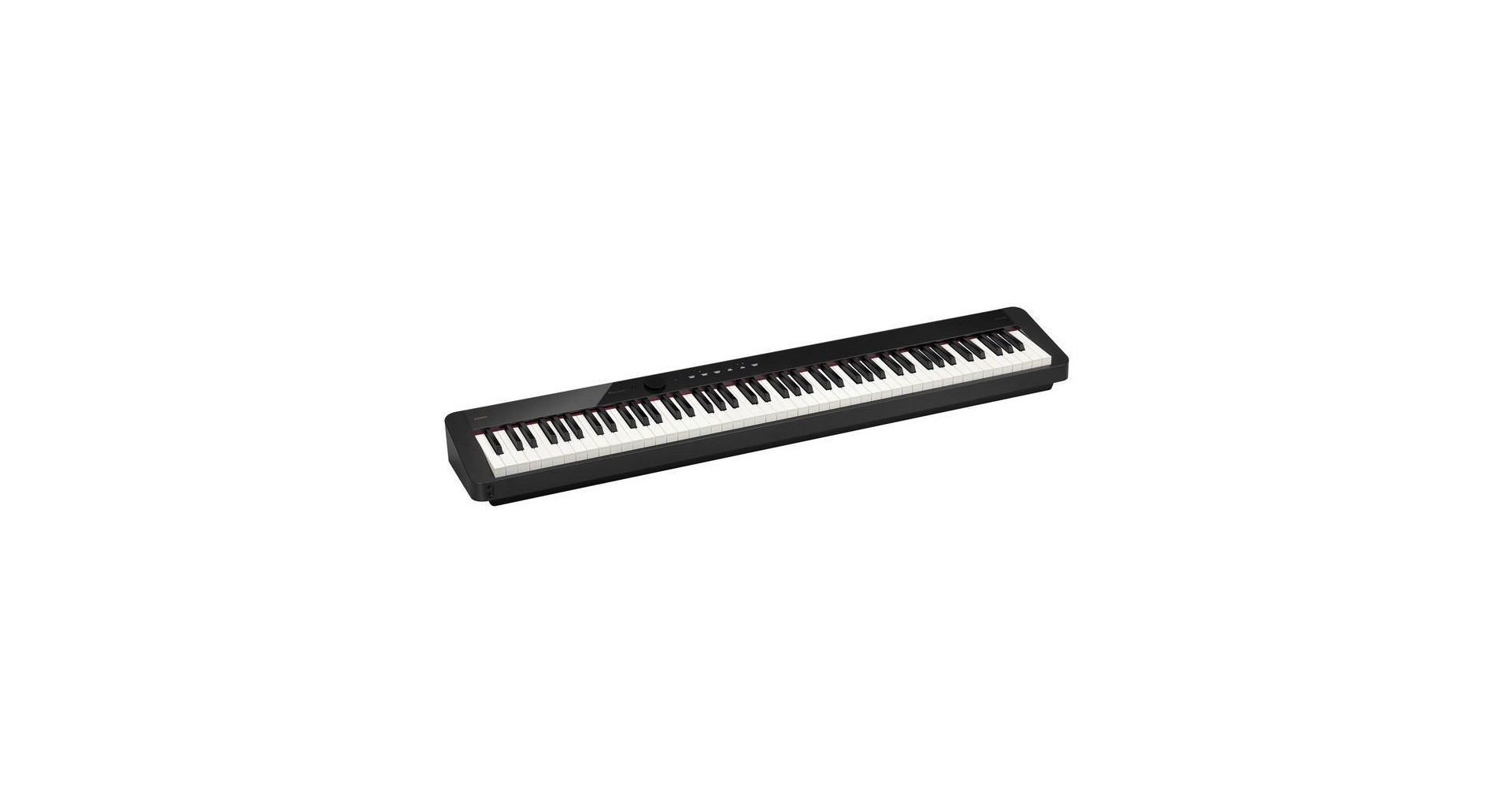 Casio PX-S1100BK este un pian digital portabil echipat cu o claviatura Smart Scaled Hammer Action cu 88 clape grele ce poate fi configurata in 5 nivele de sensibilitate. Generatorul de sunet al pianului include 18 sunete de instrumente si poate sustine o polifonie maxima de 192 voci. Pianul digital portabil Casio PX-S1100BK include un sistem audio cu 2 difuzoare de 16 x 8 cm, amplificate cu o putere totala de 16W, suficiente pentru spatii de dimensiuni mici si medii. Instrumentul poate fi alimentat atat prin adaptorul de priza inclus, precum si cu 6 baterii AA alkaline, ce ofera o autonomie de aproximativ 4 ore.