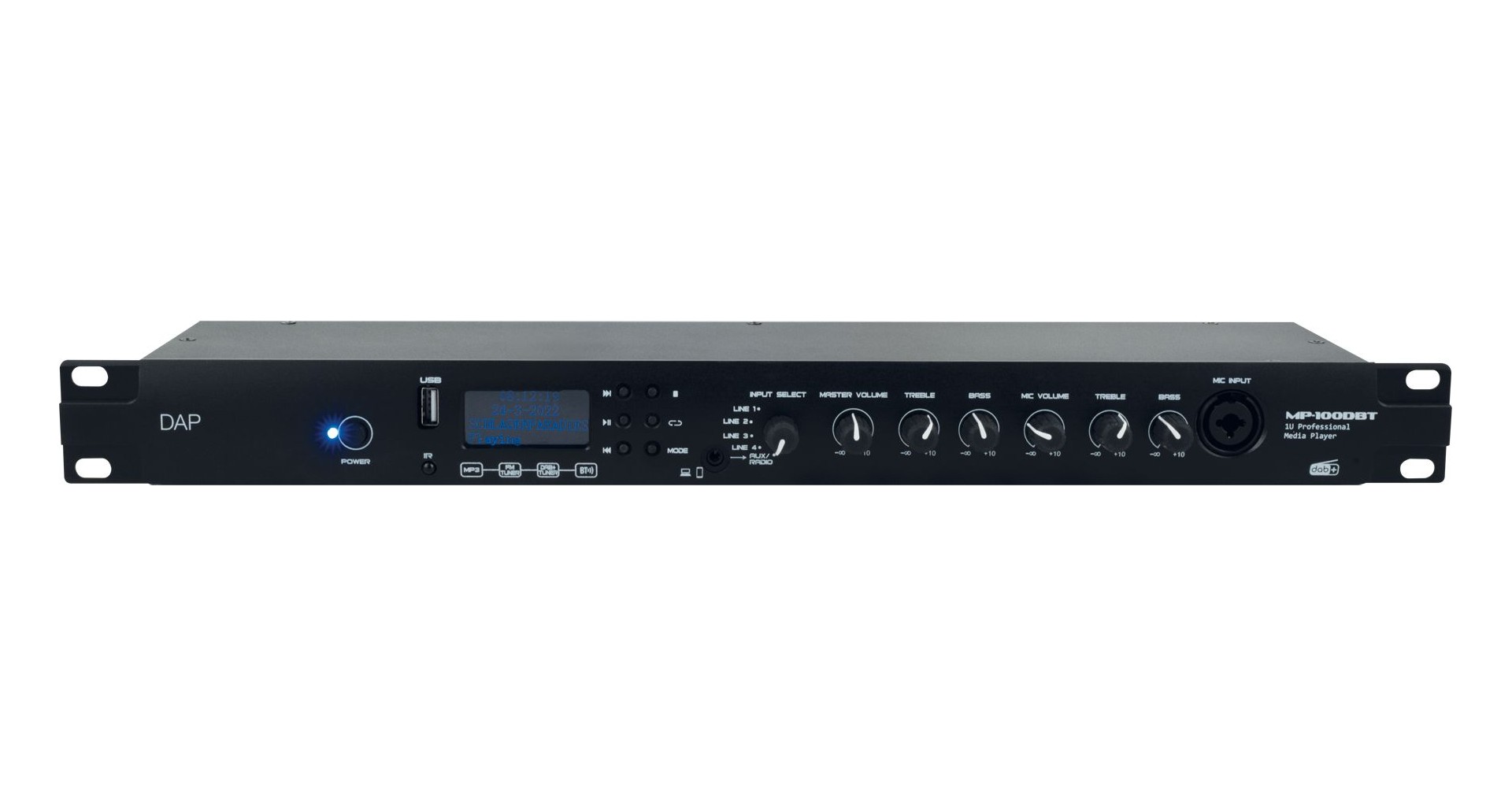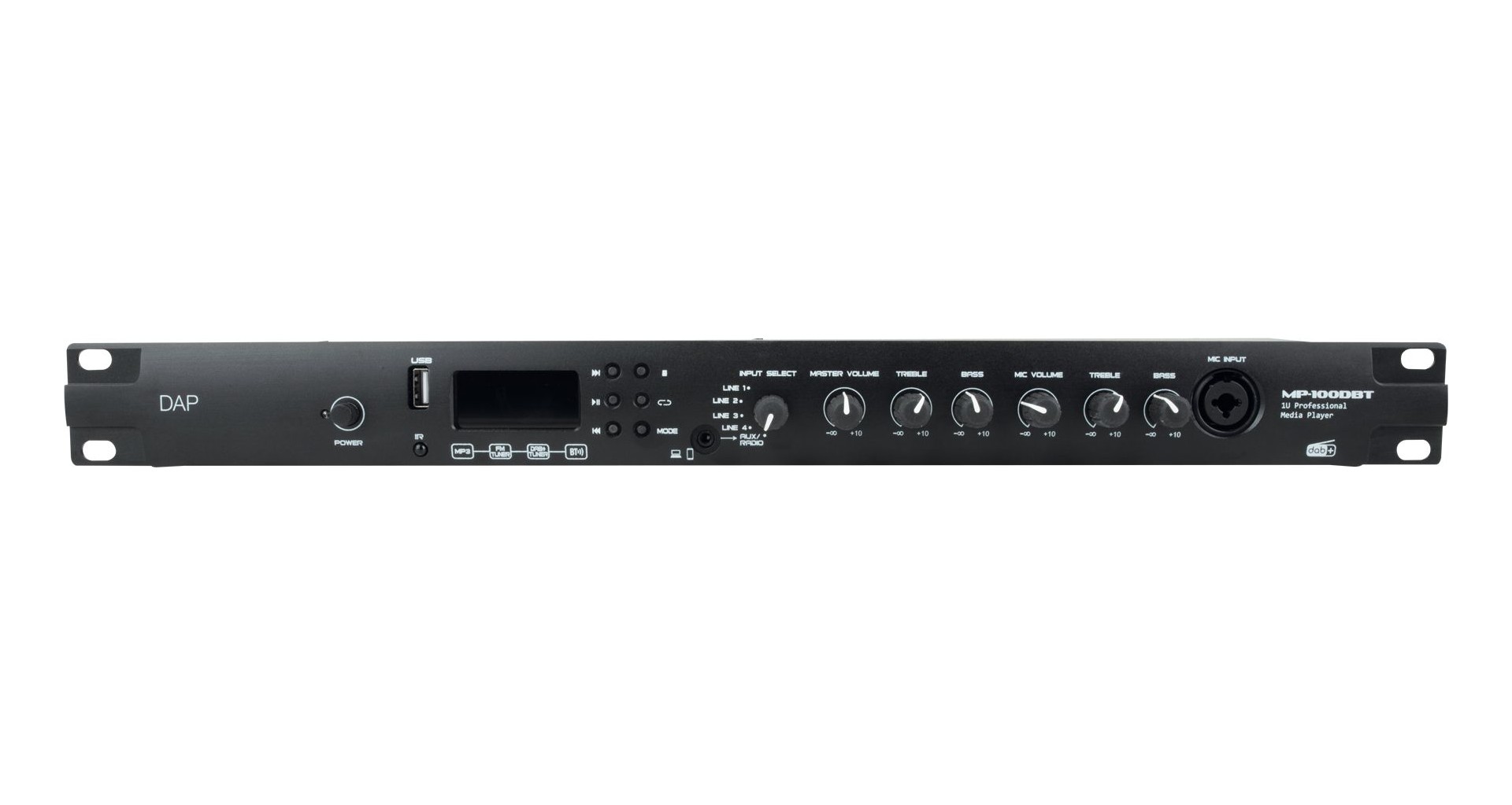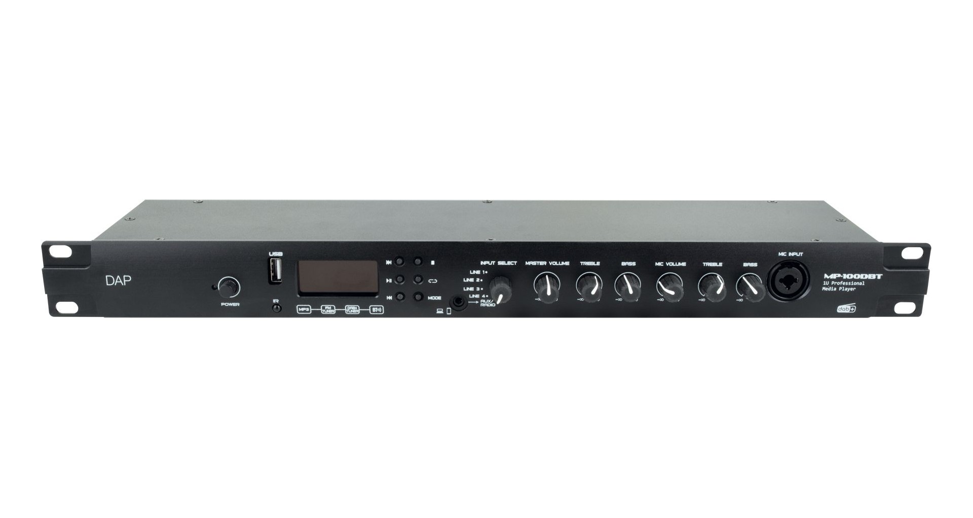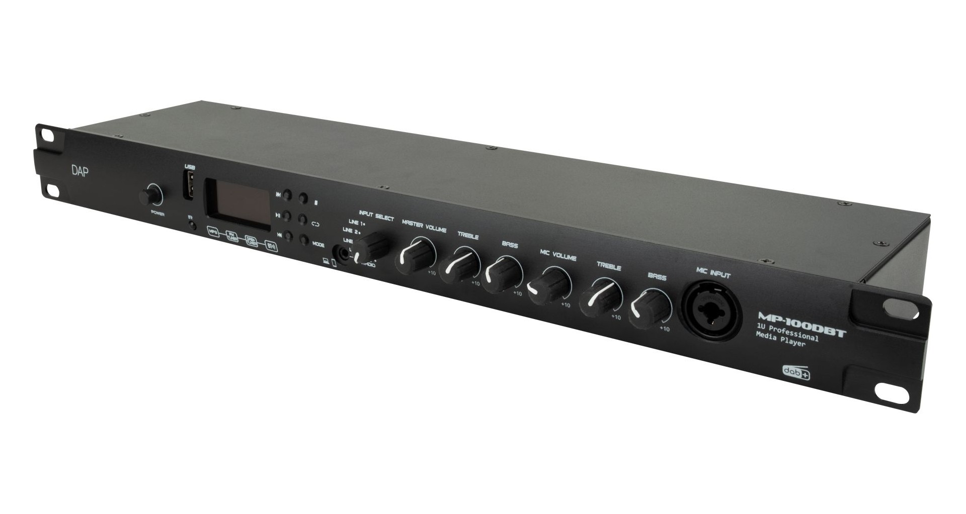 DAP MP-100DBT este un player media profesional ce include un radio FM si DAB+, conectivitate Bluetooth 4.2 si player de fisiere MP3, conceput pentru magazine, restaurante, cafenele si alte spatii similare. Player-ul este echipat cu 4 intrari de linie RCA in partea din spate, precum si cu un conector frontal USB-A pentru conectarea unui stick USB sau drive extern (suporta FAT32/pana la 32 GB), un jack mini pentru intrare auxiliara de la telefon sau laptop si o intrare de microfon cu conector XLR/Jack Combo. Intrarile de linie si microfon beneficiaza de egalizator independent cu joase si inalte, precum si de reglaj de volum. DAP MP-100DBT este echipat cu iesiri balansate XLR, precum si cu iesiri nebalansate RCA si jack.