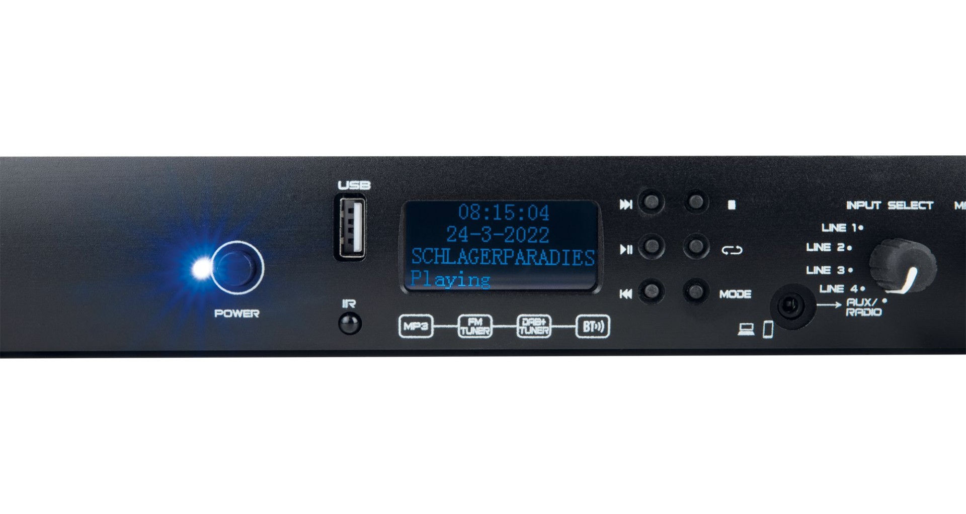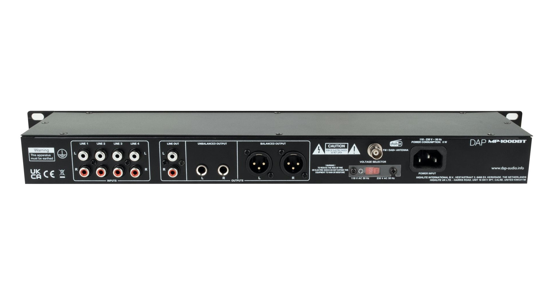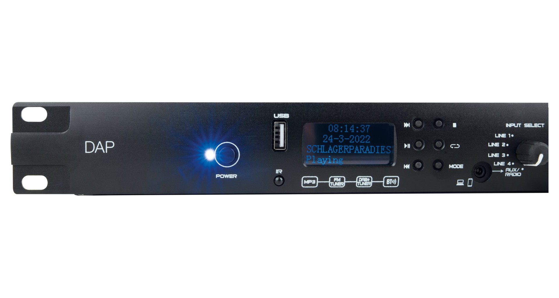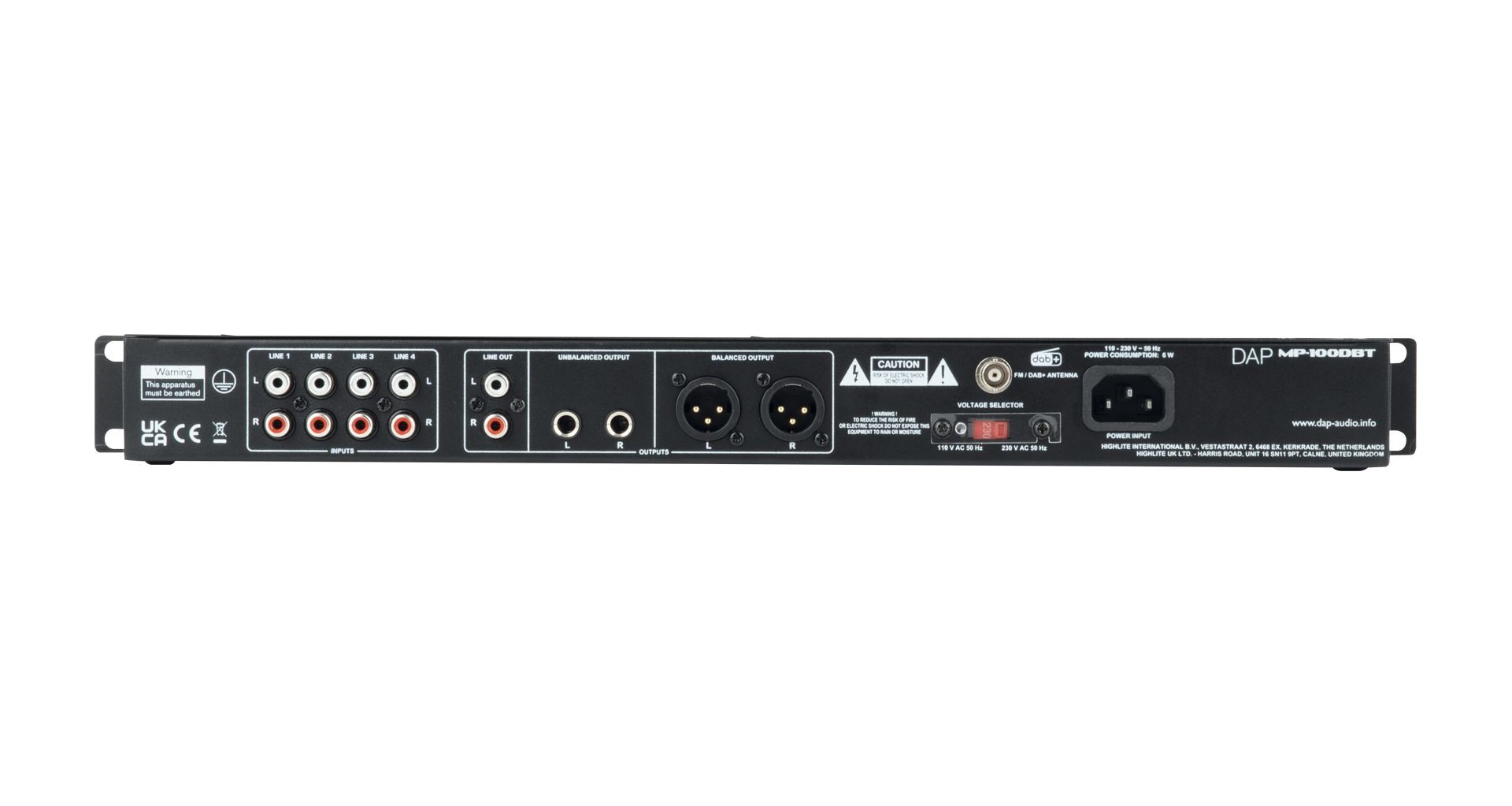 DAP MP-100DBT este un player media profesional ce include un radio FM si DAB+, conectivitate Bluetooth 4.2 si player de fisiere MP3, conceput pentru magazine, restaurante, cafenele si alte spatii similare. Player-ul este echipat cu 4 intrari de linie RCA in partea din spate, precum si cu un conector frontal USB-A pentru conectarea unui stick USB sau drive extern (suporta FAT32/pana la 32 GB), un jack mini pentru intrare auxiliara de la telefon sau laptop si o intrare de microfon cu conector XLR/Jack Combo. Intrarile de linie si microfon beneficiaza de egalizator independent cu joase si inalte, precum si de reglaj de volum. DAP MP-100DBT este echipat cu iesiri balansate XLR, precum si cu iesiri nebalansate RCA si jack.