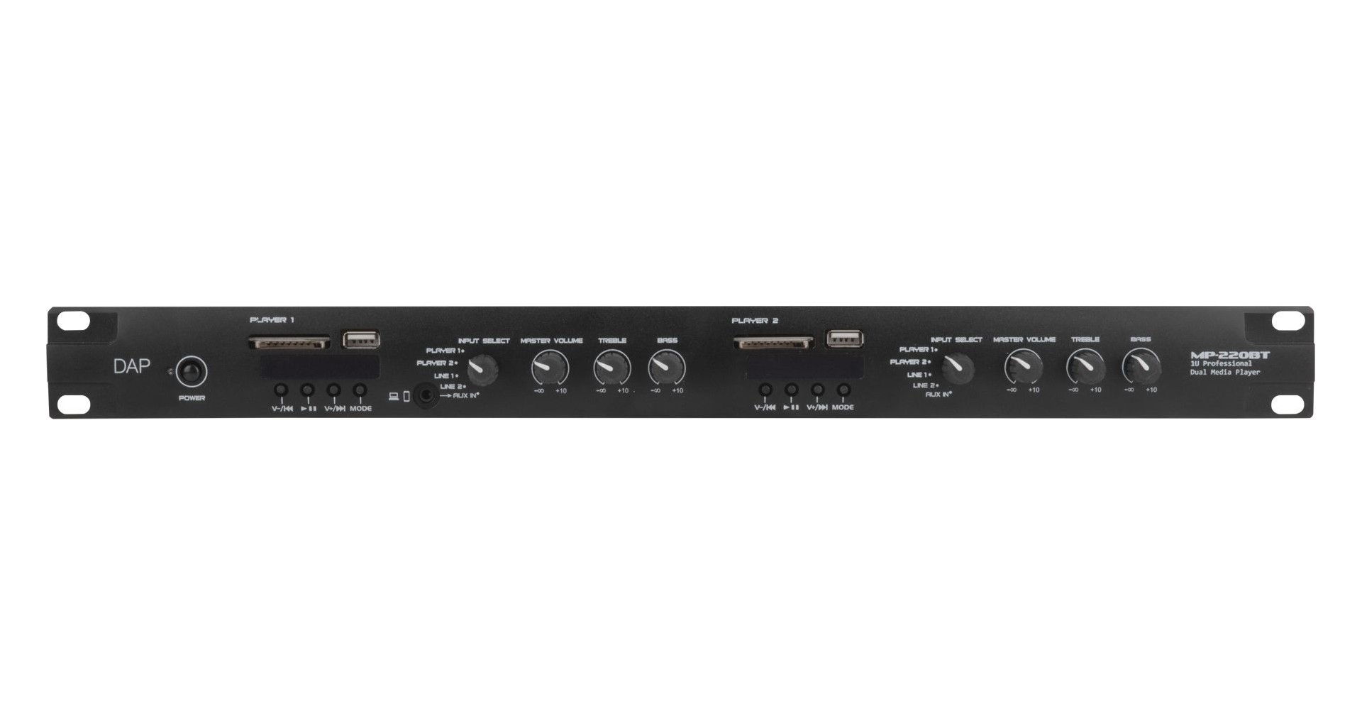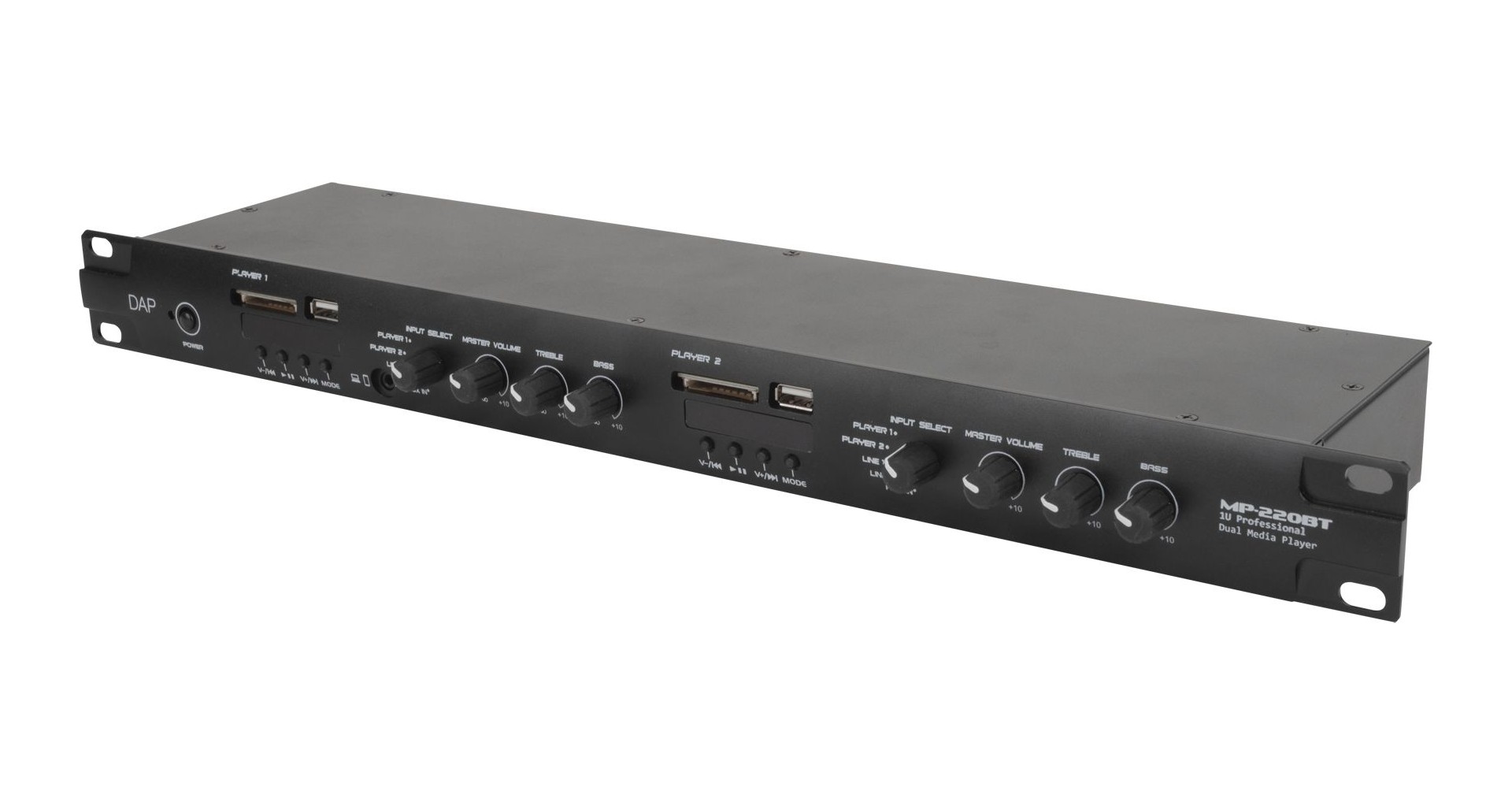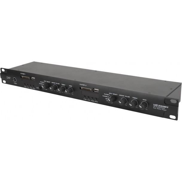 DAP Audio MP-220BT este un player media dual multifunctional ce include un radio FM, conectivitate Bluetooth 4.2, player USB si SD card pentru MP3, intrari de linie si o intrare pentru microfon de paging. Panoul din spate al player-ului include doua intrari de linie RCA si o intrare de microfon cu setari pentru joase, inalte si gain. Intrarea de microfon de paging are o setare de prioritate, intrari pentru selectarea zonei si phantom power. Partea frontala a echipamentului prezinta doi conectori USB-A pentru redare MP3 si doi conectori pentru carduri SD. DAP Audio MP-220BT include doua playere independente cu selectori de intrare, control de joase, inalte si volum, precum si iesiri separate nebalansate RCA si balansate cu conectori Pheonix.