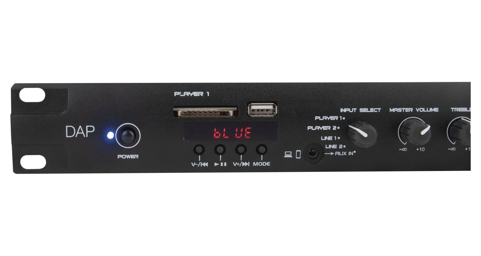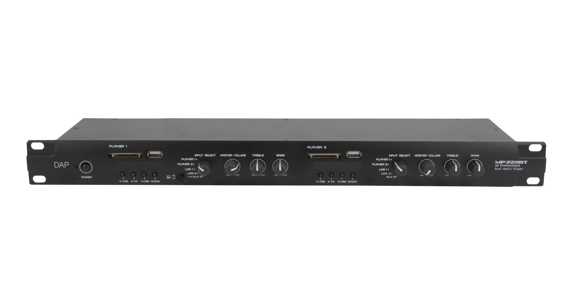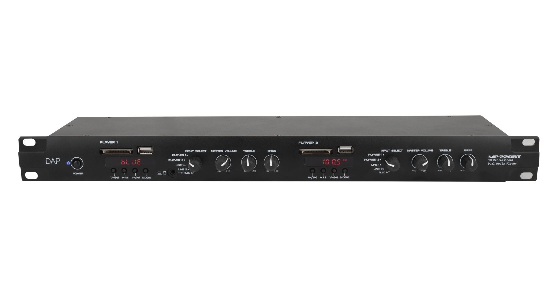 DAP Audio MP-220BT este un player media dual multifunctional ce include un radio FM, conectivitate Bluetooth 4.2, player USB si SD card pentru MP3, intrari de linie si o intrare pentru microfon de paging. Panoul din spate al player-ului include doua intrari de linie RCA si o intrare de microfon cu setari pentru joase, inalte si gain. Intrarea de microfon de paging are o setare de prioritate, intrari pentru selectarea zonei si phantom power. Partea frontala a echipamentului prezinta doi conectori USB-A pentru redare MP3 si doi conectori pentru carduri SD. DAP Audio MP-220BT include doua playere independente cu selectori de intrare, control de joase, inalte si volum, precum si iesiri separate nebalansate RCA si balansate cu conectori Pheonix.