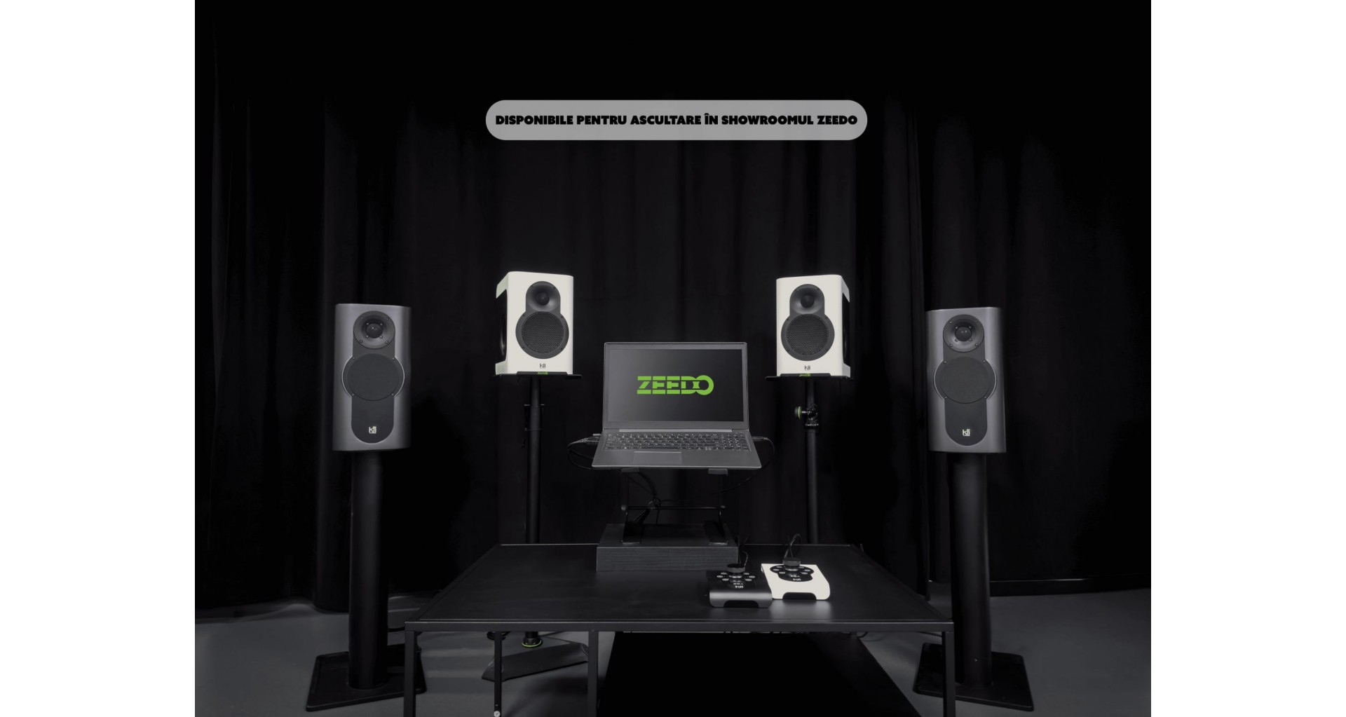 Sistemul include doua monitoare Kii THREE PRO, impreuna cu controllerul Kii CONTROL plus toate cablurile necesare.
