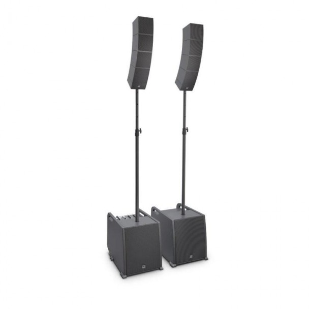 Sistem de sonorizare LD Systems compus din 2 subwoofere de 10 inchi cu mixer de 4 canale integrat, 8 sateliti tip array si putere de 920W, potrivit pentru conferinte si evenimente mobile.