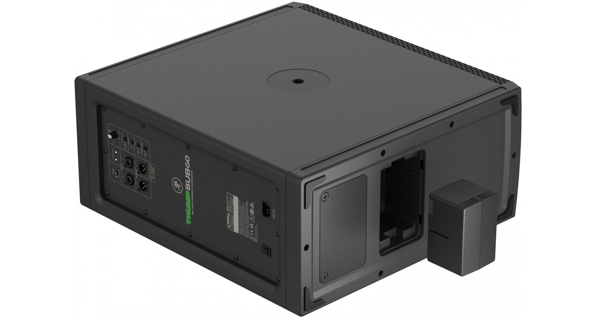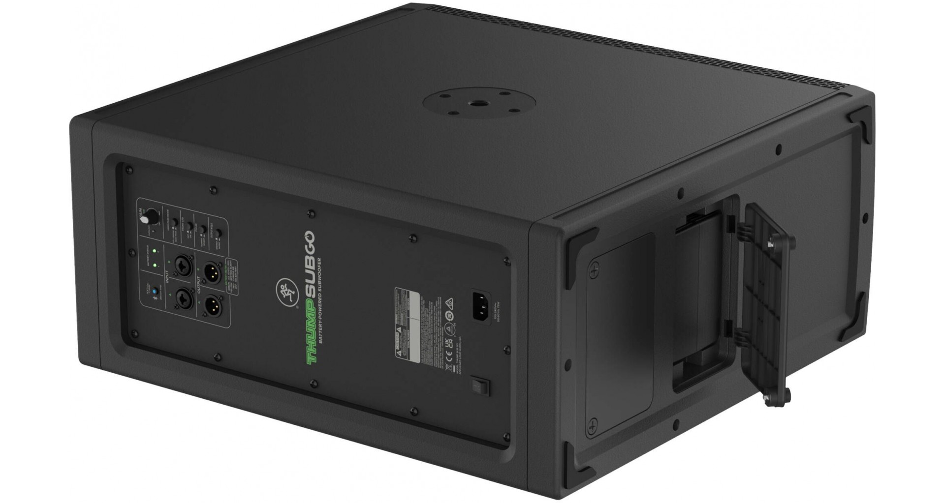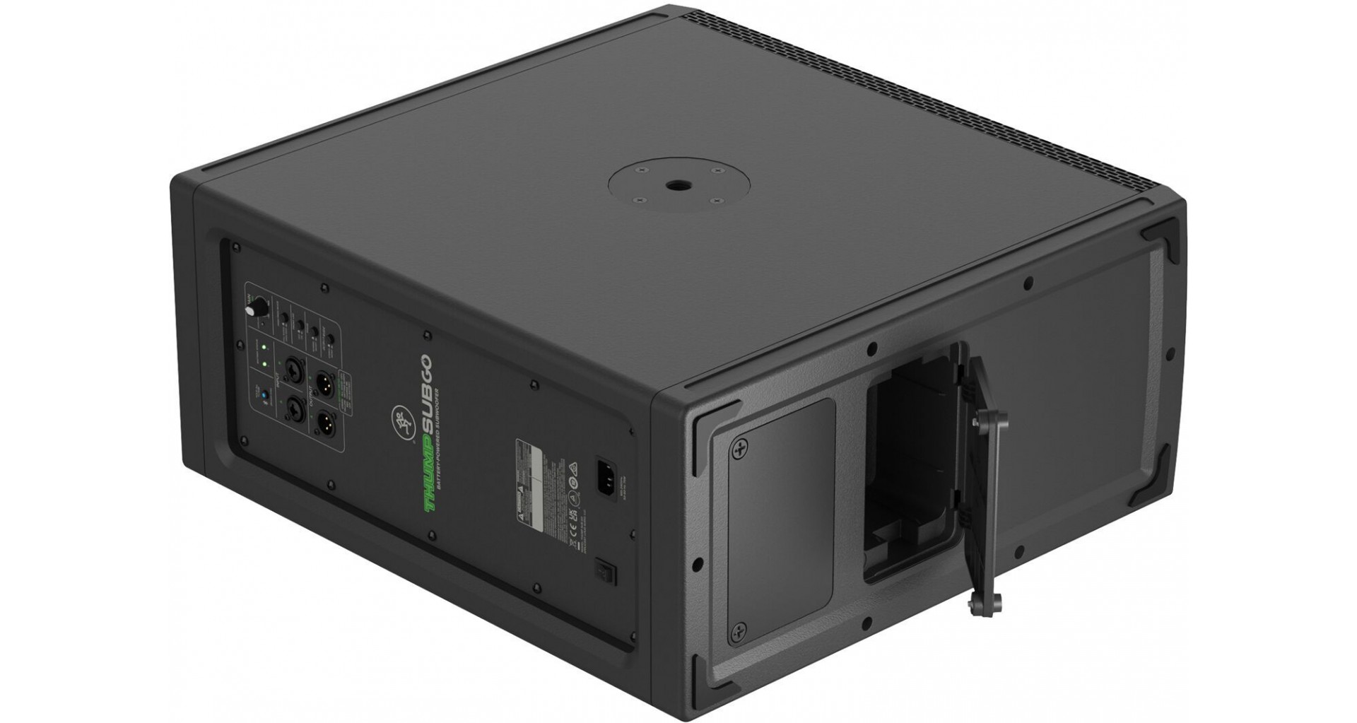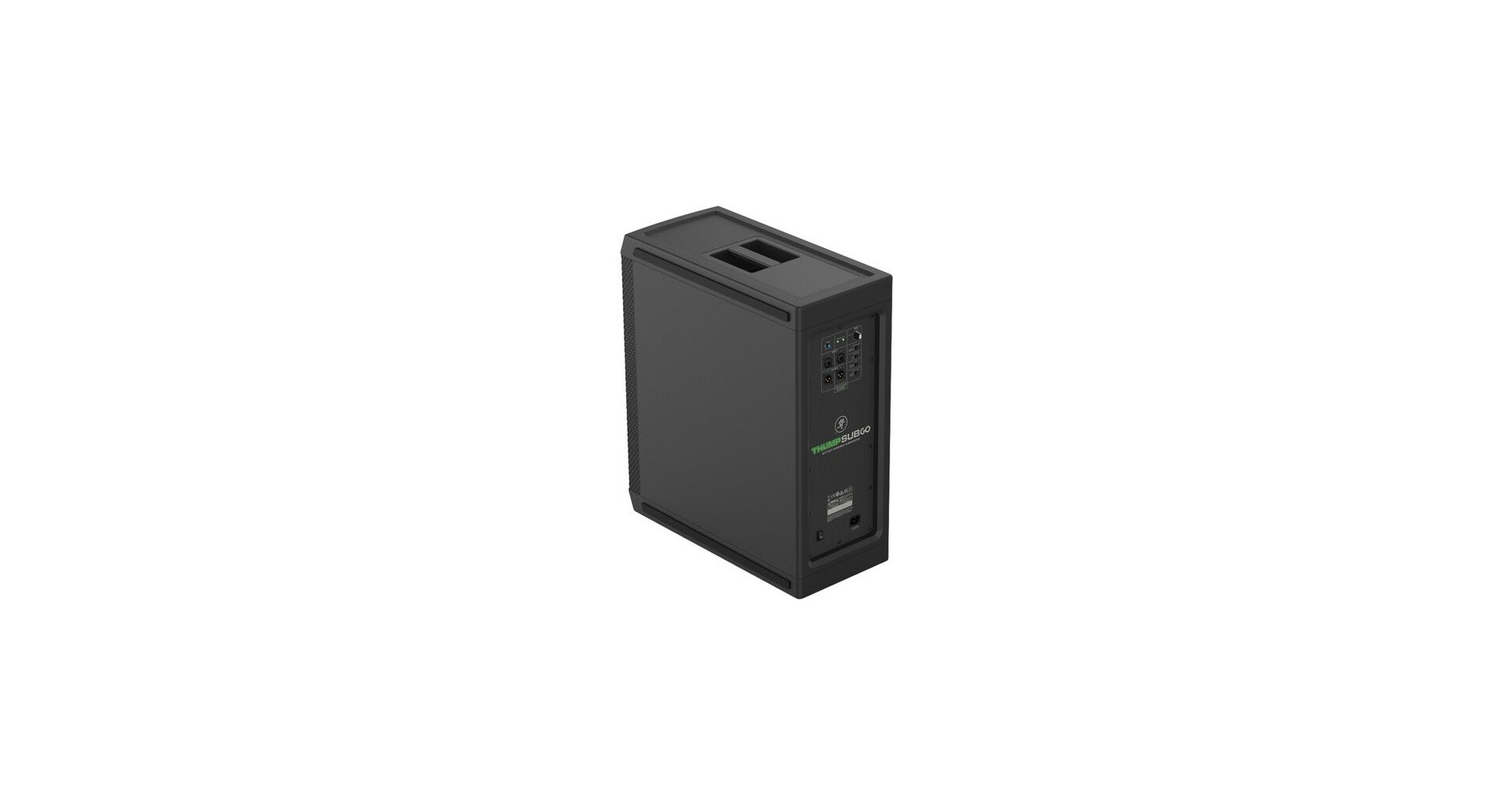 Mackie ThumpSub GO este un subwoofer portabil activ cu doua difuzoare de 8 inch si amplificare Class-D cu o putere de 400W in peak, capabil sa ofere un raspuns in frecventa de la 32 Hz pana la 152 Hz si un SPL maxim de 123 dB. Dispune de doua sloturi pentru baterii reincarcabile, ce pot fi schimbate in timpul functionarii si asigura pana la 12 ore de autonomie (este inclusa o baterie GB-200 pentru maxim 6 ore de autonomie). Conectivitatea include doua intrari combo XLR/TRS, doua iesiri XLR si Bluetooth 5.4 pentru redare wireless. Functiile esentiale precum filtru high-pass, mod full-range, faza inversa si optiuni stereo/mono il fac versatil in diverse configuratii. Designul compact, manerul ergonomic si posibilitatea de montare a unui stativ de boxa completeaza portabilitatea.