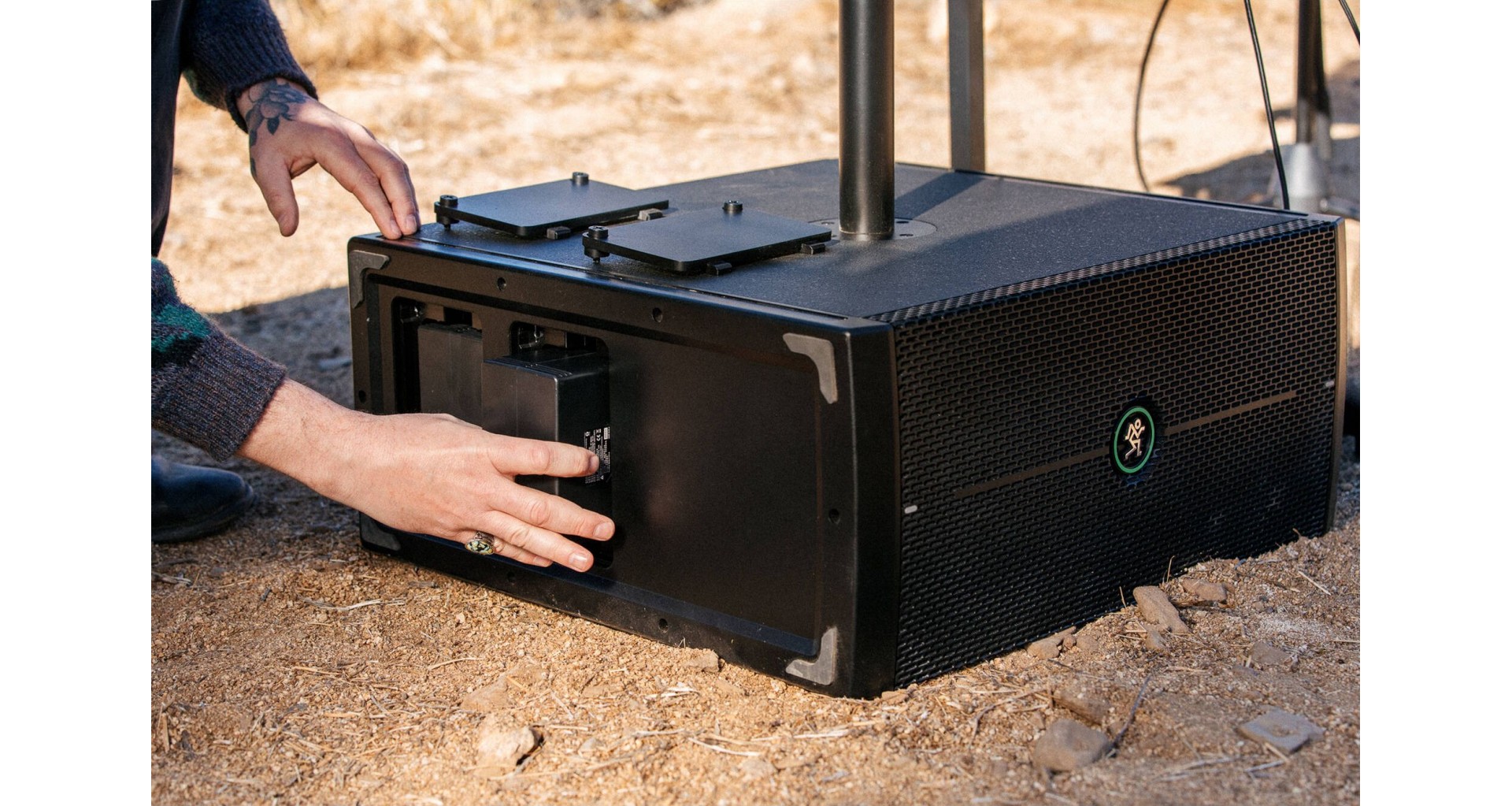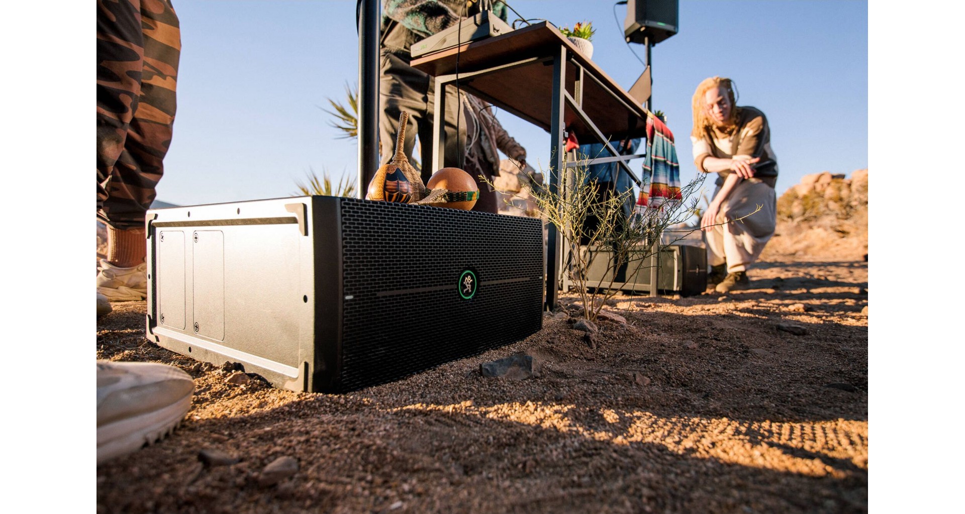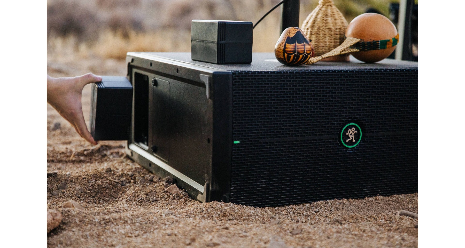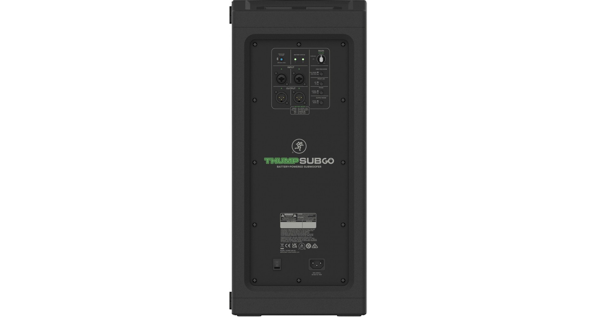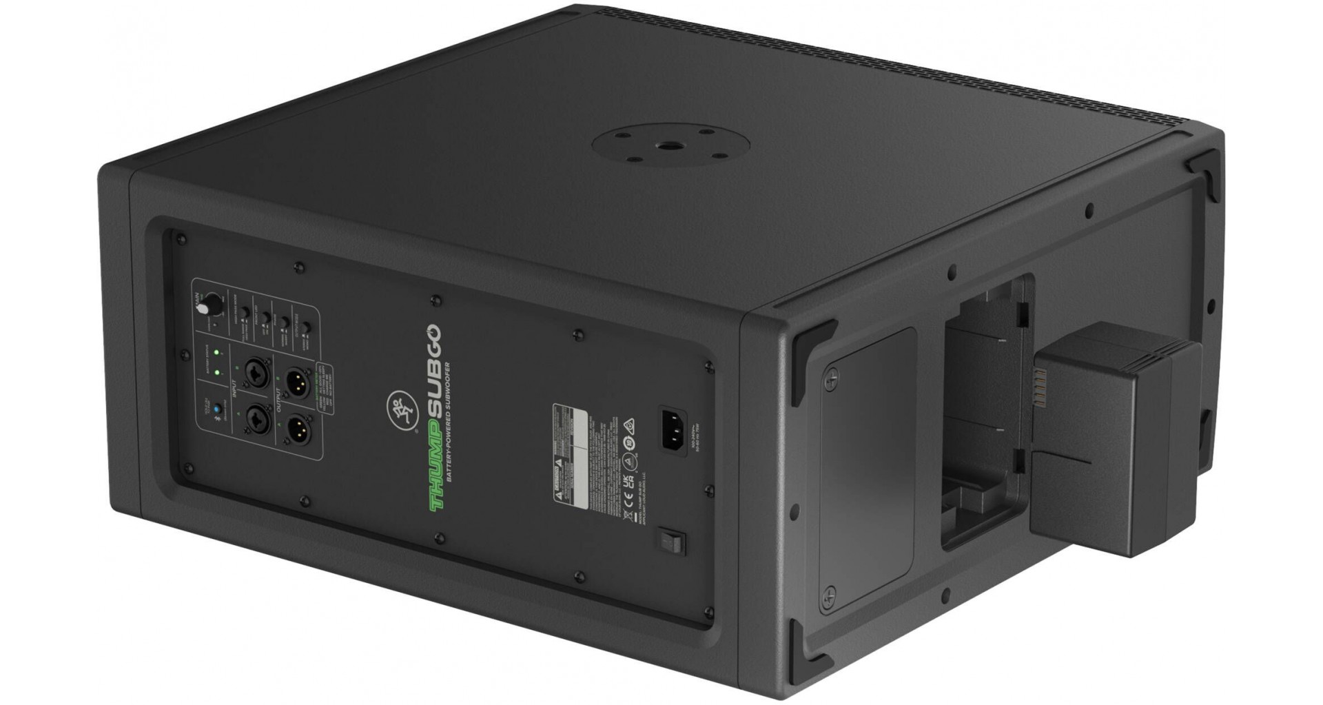 Mackie ThumpSub GO este un subwoofer portabil activ cu doua difuzoare de 8 inch si amplificare Class-D cu o putere de 400W in peak, capabil sa ofere un raspuns in frecventa de la 32 Hz pana la 152 Hz si un SPL maxim de 123 dB. Dispune de doua sloturi pentru baterii reincarcabile, ce pot fi schimbate in timpul functionarii si asigura pana la 12 ore de autonomie (este inclusa o baterie GB-200 pentru maxim 6 ore de autonomie). Conectivitatea include doua intrari combo XLR/TRS, doua iesiri XLR si Bluetooth 5.4 pentru redare wireless. Functiile esentiale precum filtru high-pass, mod full-range, faza inversa si optiuni stereo/mono il fac versatil in diverse configuratii. Designul compact, manerul ergonomic si posibilitatea de montare a unui stativ de boxa completeaza portabilitatea.