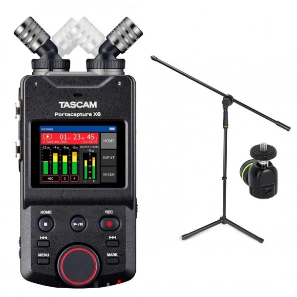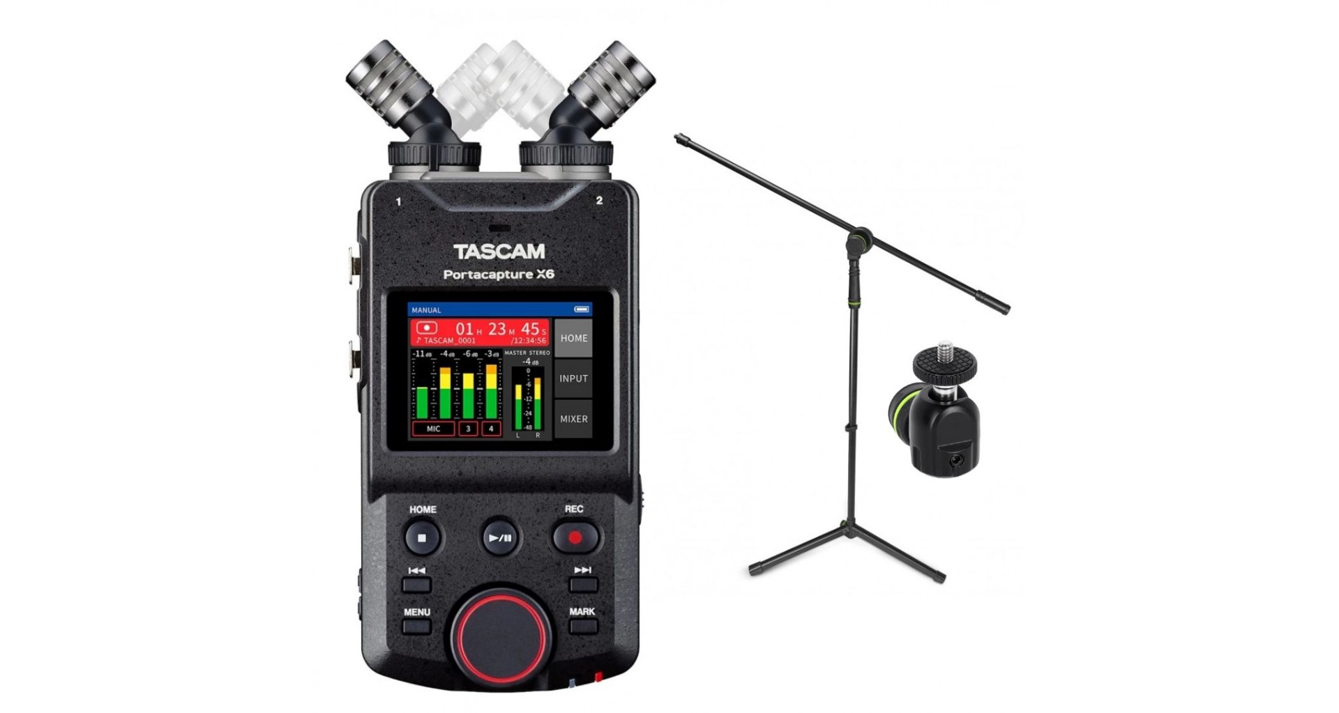 Pachet compus din Recorder portabil Tascam Portacapture X6, Stativ pentru microfon Gravity MS 5311 B si Adaptor unghi camera Gravity MS QT 2 B.