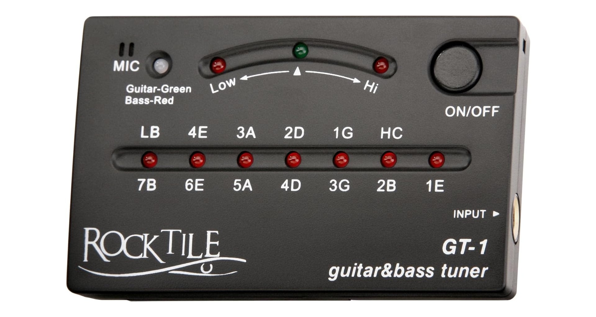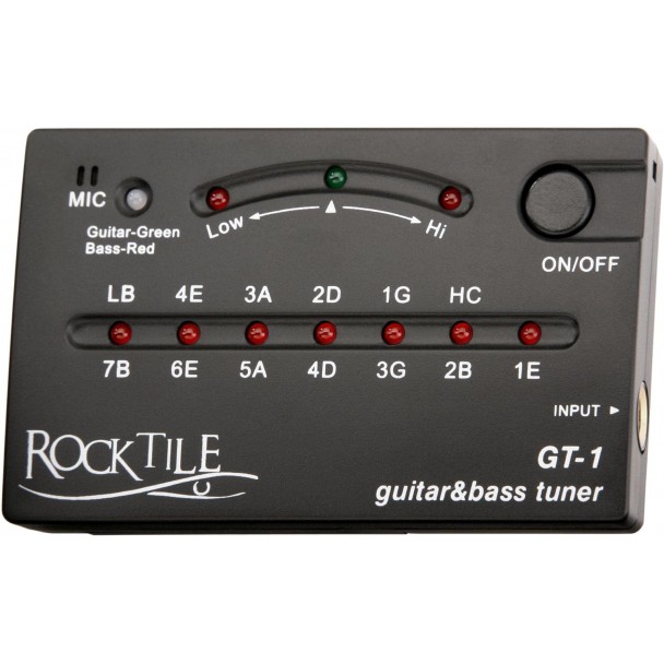 Rocktile GT-1 este un tuner ce poate fi folosit atat pentru a acorda chitare, cat si chitare bass. Acesta permite acordarea chitarelor cu pana la 7 corzi si a chitarelor bass cu cel mult 6 corzi. Tunerul include un microfon ce ajuta la acordarea instrumentelor acustice si o intrare jack 6.3 mm pentru instrumentele electrice.