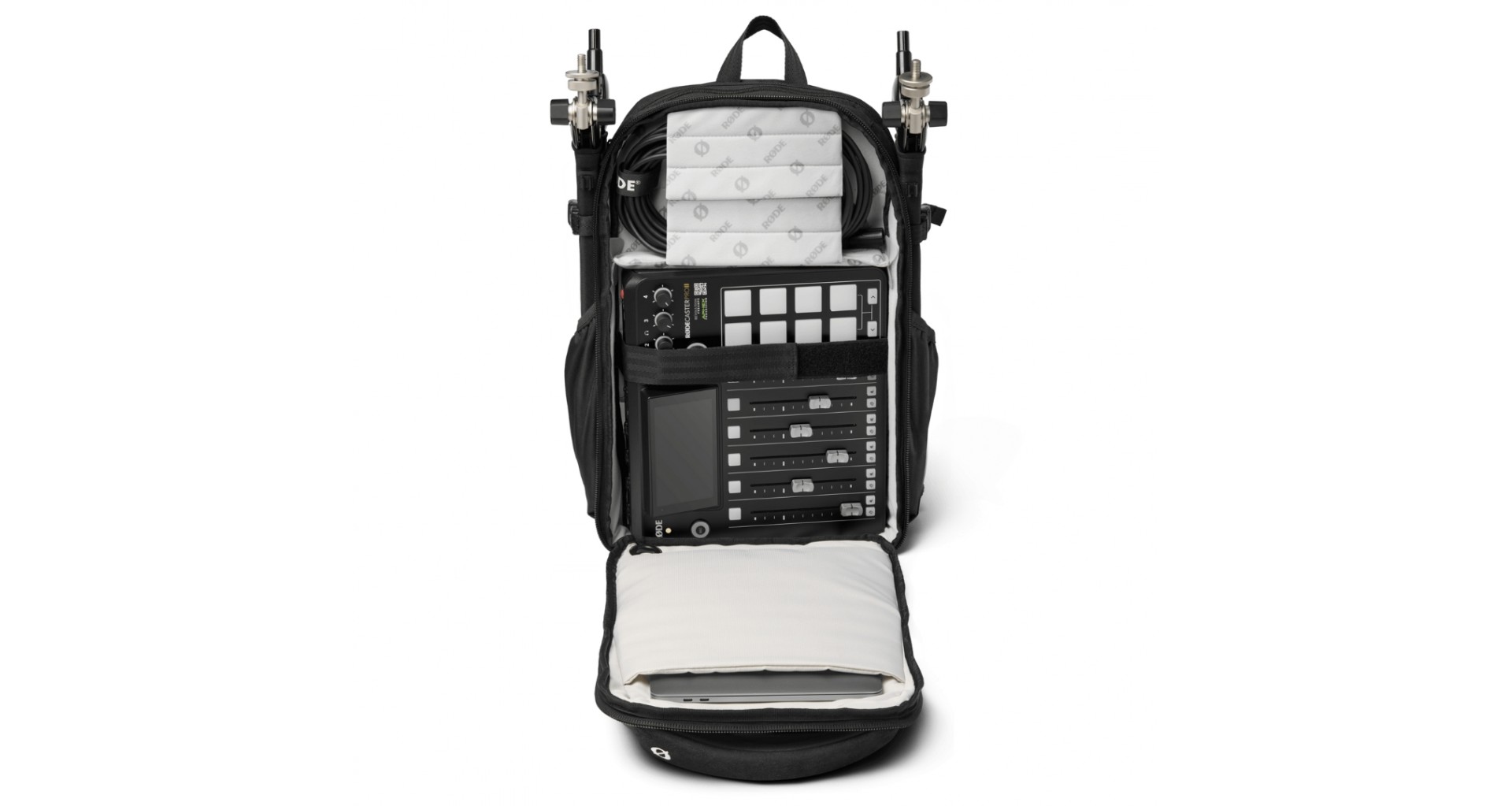 Ofera spatiu pentru un RØDECaster Pro/Pro II, microfoane, accesorii si laptopuri de pana la 16 inci, avand bretele ergonomice reglabile si compartimente suplimentare pentru depozitare.