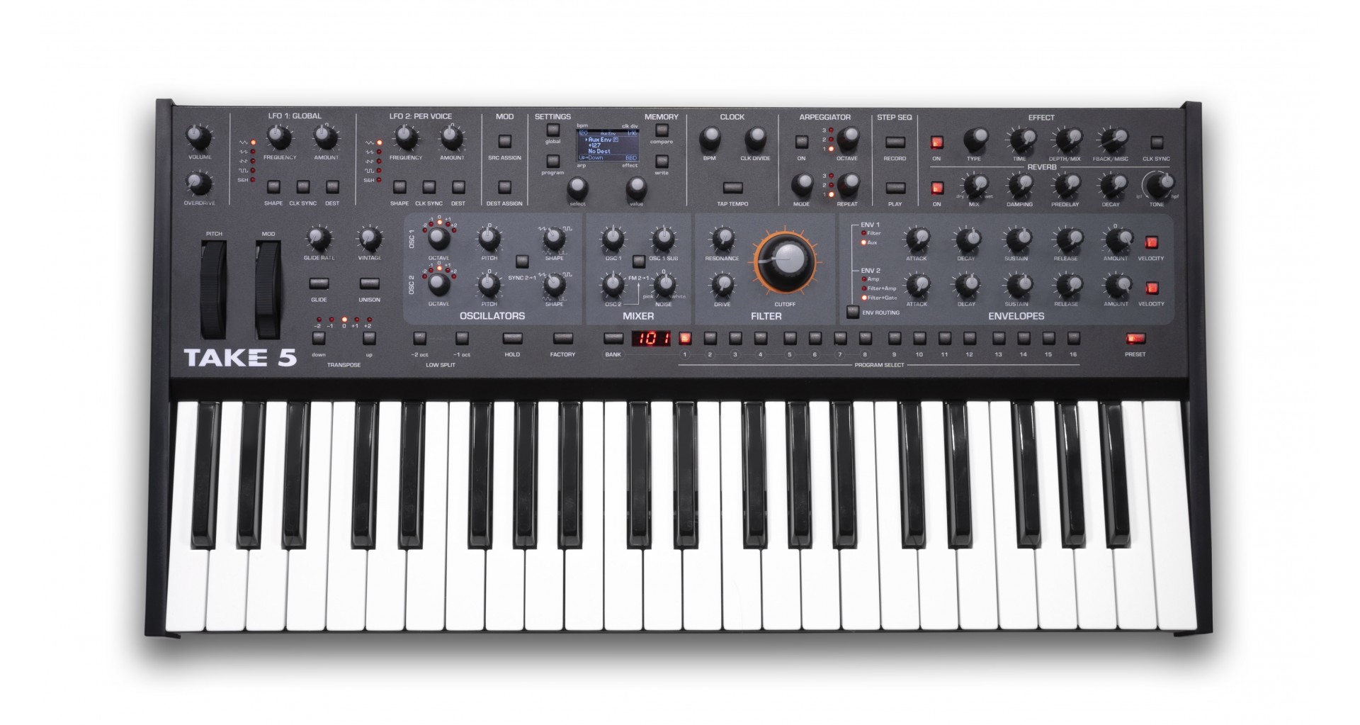 Setul de caracteristici ale Take 5 este completat cu doua LFO-uri (1 global si 1 pe voce), doua ADSR+ delay, modulatie extinsa, un sequencer polifonic 64-step si un arpegiator multimode.