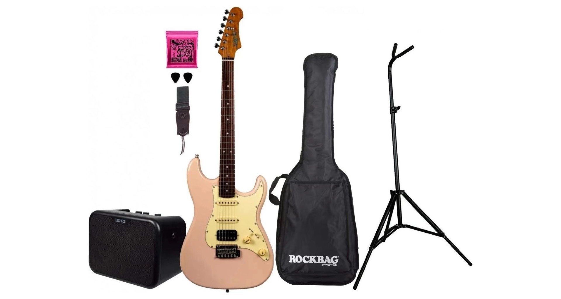 Set Chitara Electrica JET ce include chitara electrica JS-400 PK R, Joyo JMA-10E, husa, CNB S40 GN, corzi, stativ si doua pene Ernie Ball Nylon Pick Heavy.