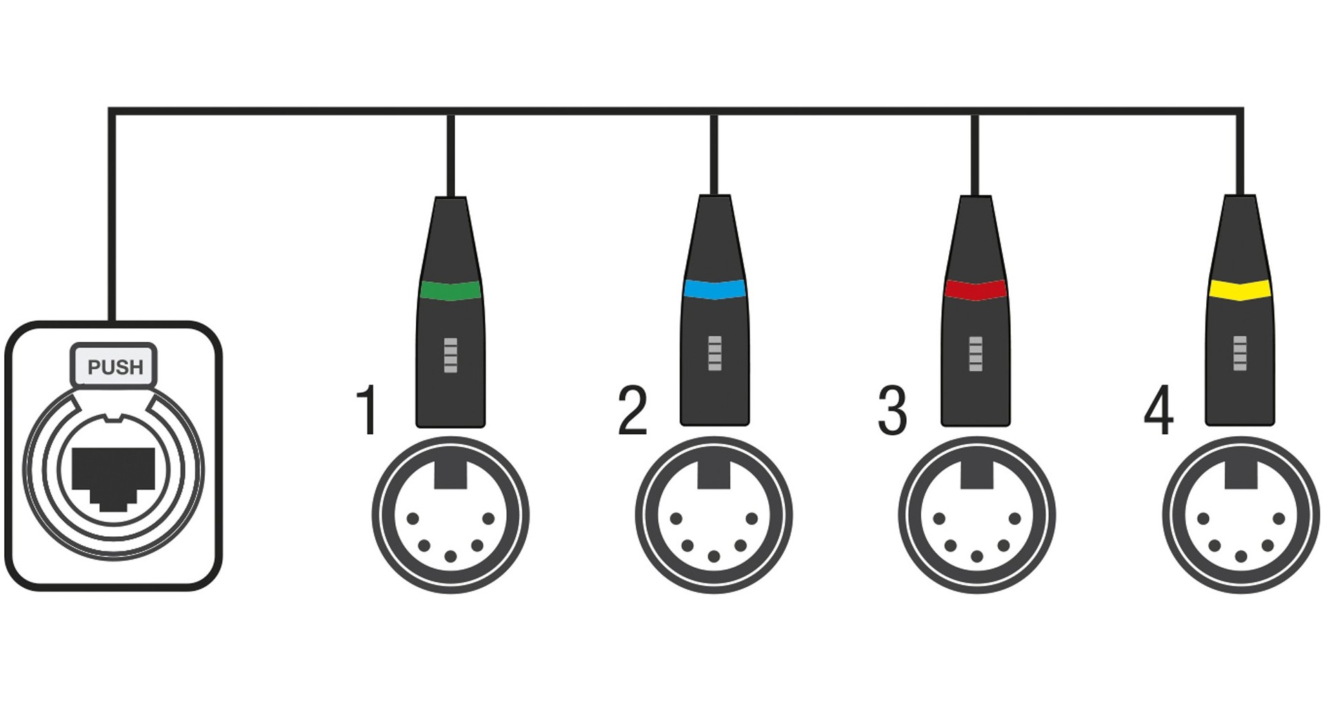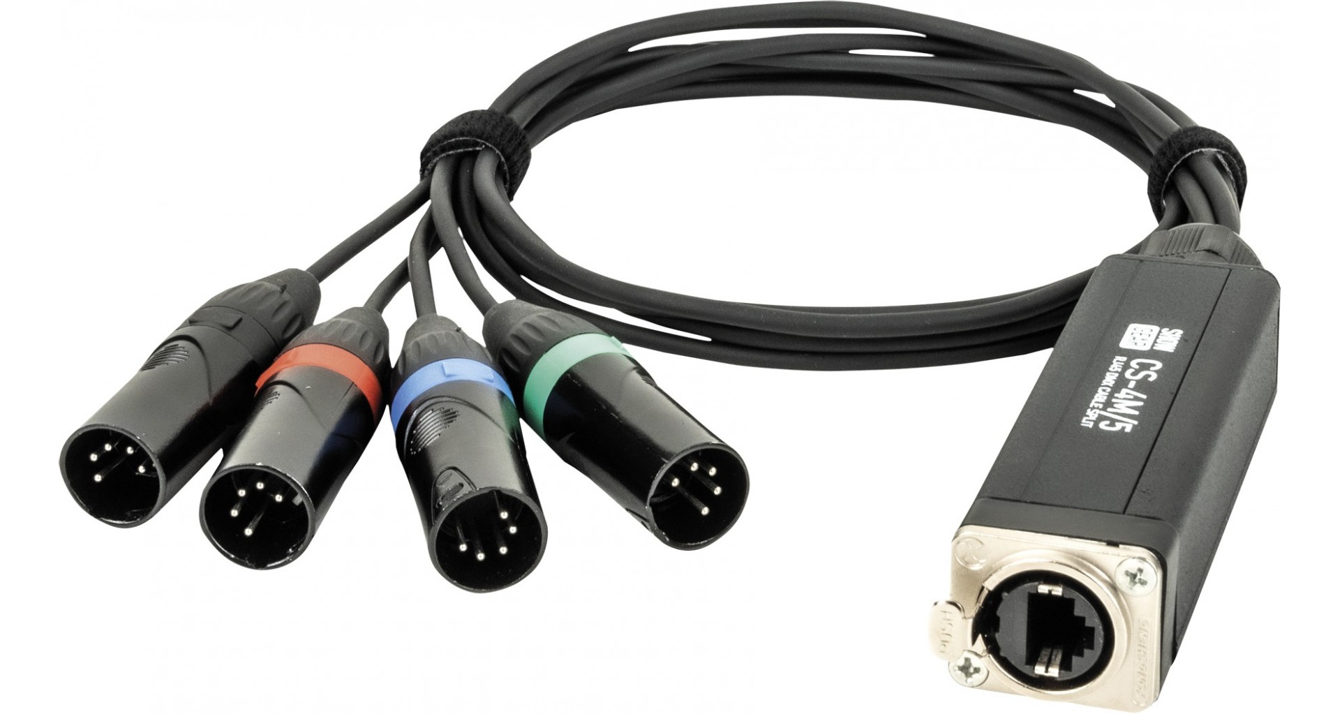 Acesta permite transmiterea de date din patru universuri printr-un singur cablu CAT. Toti conectorii tata DMX sunt colorati pentru a ajuta la identificarea acestora si au cabluri cu o lungime de 75 cm.