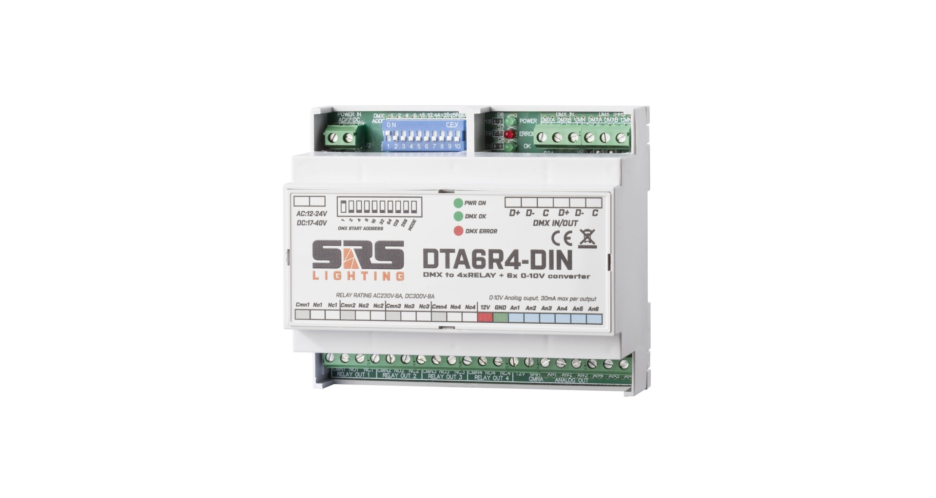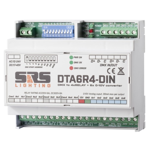 DTA6R4-DIN este un convertor DMX, ce ofera control al dispozitivelor precum LED-uri, motoare, invertoare de frecventa etc. folosind linia DMX.