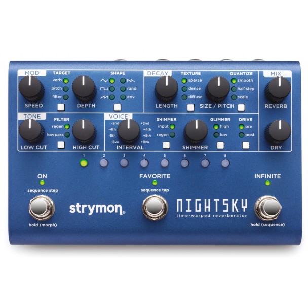 Strymon NightSky este o pedala de reverb revolutionara si complexa, cu nenumarate posibilitati tonale. Se pot obtine de reverberatii simple pana la shimmer, intervale sau sunete de sintetizator, toate aceste posibilitati ducand sunetul de chitara in zone cu totul noi.