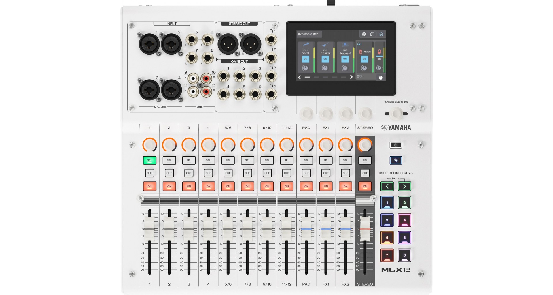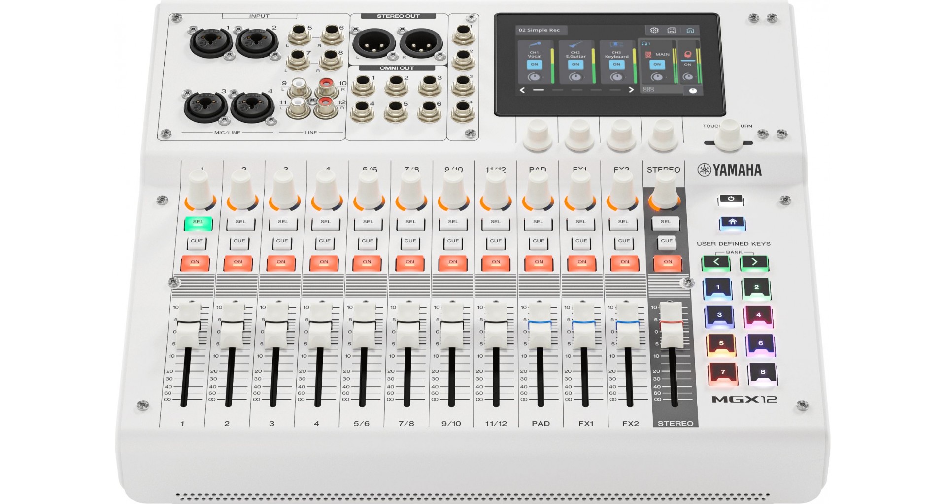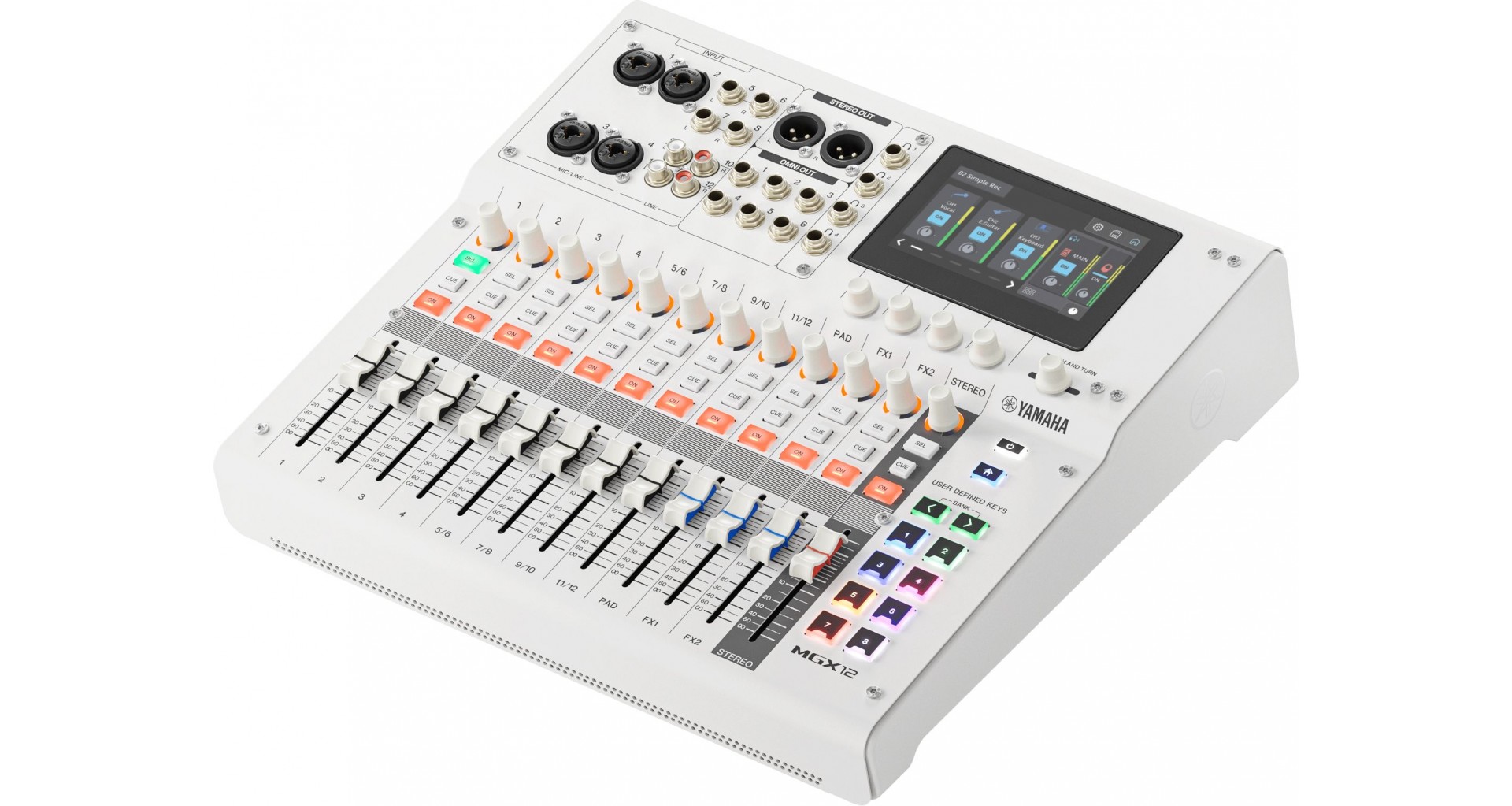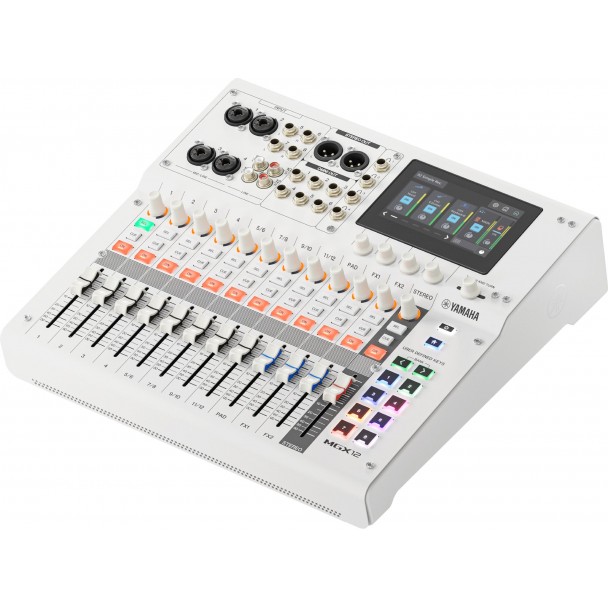 Yamaha MGX12 este un mixer digital compact cu 12 canale, destinat aplicatiilor de live, streaming si productie audio. Dispune de 8 bus-uri Mix, 2 FX, CUE si stereo master, 11+1 fadere (nemotorizate), control rotativ pe fiecare canal si display touchscreen de 4.3 inch cu cinci encodere dedicate. Mixerul integreaza un procesor DSP cu monitorizare fara latenta, interfata audio USB, Bluetooth 5.0 si slot card microSD. Permite inregistrarea a 16 track-uri simultan si poate functiona la rezolutii de pana la 96 kHz / 24-bit. Conectica include intrari combo XLR/jack, iesiri XLR si jack, patru iesiri de casti si doua porturi USB-C. Mixerul are un design compact, o greutate de 3.9 kg si un finisaj alb.